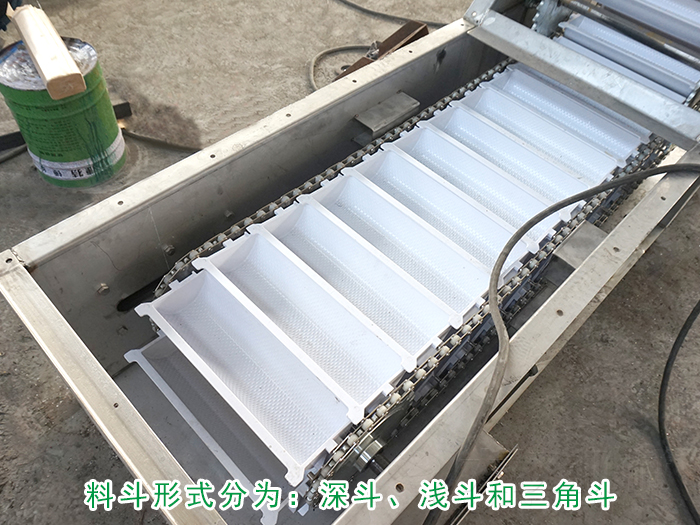 淺斗的斗中與料斗后壁的夾角小,每個料斗的裝載量小,但容易卸空,適于運送潮濕的和粘性的物料。深和淺斗在斗式提升及沿牽引構件長度方向間隔一定距離地固定在牽引構件上。