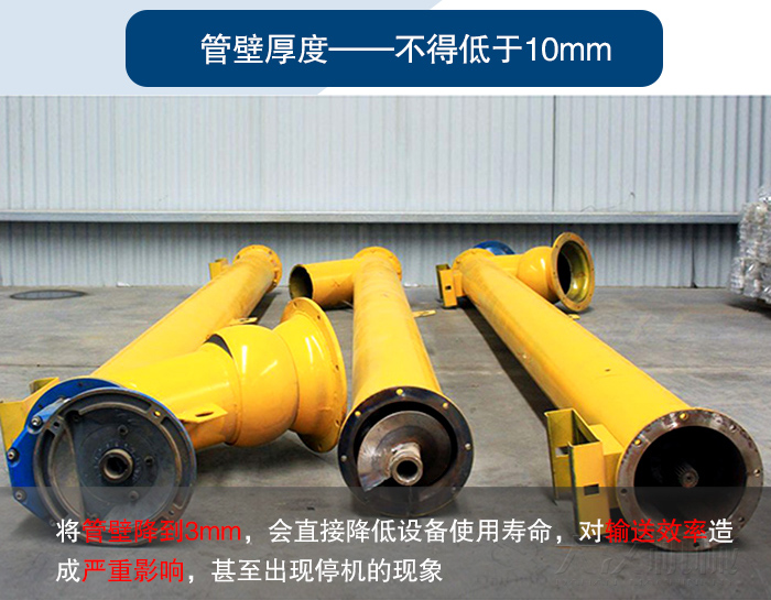 一般情況下,管式螺旋輸送機(jī)管壁厚度要求不低于10mm,有些廠家為了在其中賺取更多利益,將管壁降到了3mm,會直接降低設(shè)備使用壽命,對輸送效率造成嚴(yán)重影響,甚至出現(xiàn)停機(jī)的現(xiàn)象。