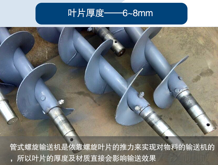 管式螺旋輸送機(jī)是依靠螺旋葉片的推力來實現(xiàn)對物料的輸送機(jī)的,所以葉片的厚度及材質(zhì)直接會影響輸送效果,葉片厚度一般在6~8mm左右,也可以根據(jù)物料的耐磨程度來加厚,這些直接與設(shè)備的使用壽命掛鉤的,所以用戶在選型時要特別注意這一點。