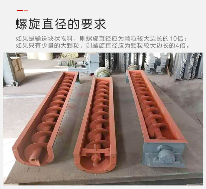 5.螺旋直徑對(duì)于絞龍輸送機(jī)的螺旋直徑來(lái)講,應(yīng)滿足的要求有:如果是輸送塊狀物料,則螺旋直徑應(yīng)為顆粒較大邊長(zhǎng)的10倍;如果只有少量的大顆粒,則螺旋直徑應(yīng)為顆粒較大邊長(zhǎng)的4倍。