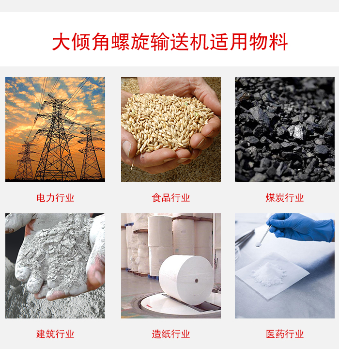 大傾角螺旋輸送機的適用范圍非常廣泛,例如糧食工業、建筑材料工業、化學工業、機械制造業、交通運輸業等。其適用于各種粉狀、粒狀、小塊狀物料,還有可以輸送粘性,帶狀易纏繞的特殊型號。粒物料如谷物、豆類、面粉等食品類,干水泥、粘土、沙子等建筑類,鹽類、堿類、化肥等化學類,還有礦石等其他類別,粘性物料如濕水泥等,易纏繞物料如生活垃圾等。總之大傾角螺旋輸送機被廣泛應用于各行各業,可見其重要性,也印證了它是有價值的。
