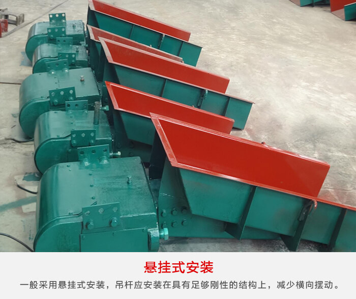 電磁振動(dòng)給料機(jī)一般采用懸掛式安裝,吊桿應(yīng)安裝在具有足夠剛性的結(jié)構(gòu)上, 為了減少電磁振動(dòng)給料機(jī)的橫向擺動(dòng), 懸掛吊桿應(yīng)向外張開(kāi) 10°左右布置。對(duì)于大型給料機(jī), 為了維修和更換料槽方便,還應(yīng)設(shè)置移動(dòng)滑架。