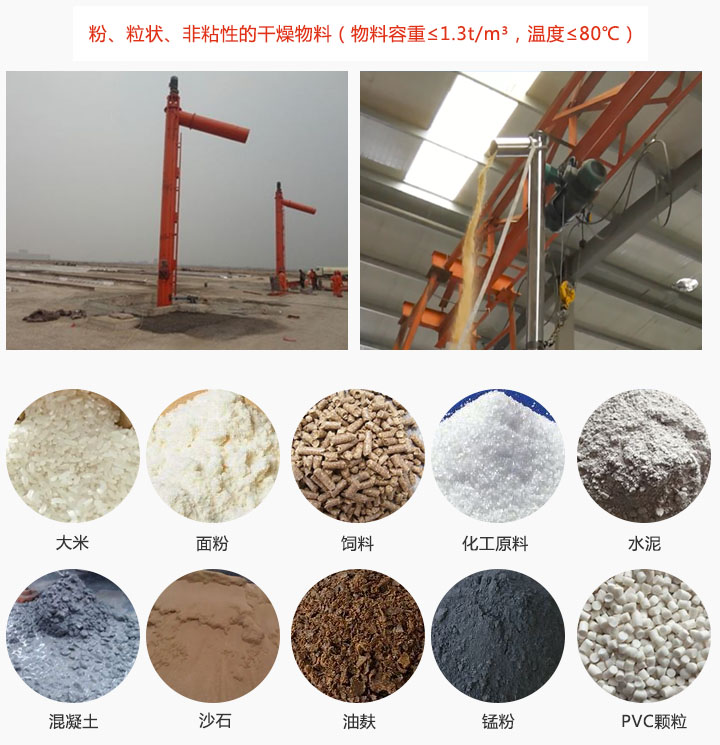 垂直螺旋輸送機可輸送大米,面粉,飼料、化工原料、水泥、混凝土等粉、粒狀、非粘性的干燥物料(物料容重≤1.3t/m³,溫度≤80℃);在輸送同時也可對物料進行干燥和冷卻等功能。