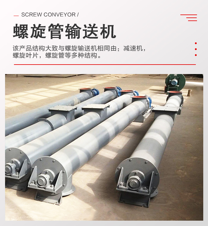螺旋管輸送機(jī)就是螺旋輸送機(jī),準(zhǔn)確的說(shuō)是管式螺旋輸送機(jī)。該設(shè)備整體由圓管構(gòu)成,所以很多人稱之為螺旋管輸送機(jī)。該產(chǎn)品結(jié)構(gòu)大致與螺旋輸送機(jī)相同由:減速機(jī),螺旋葉片,螺旋管等多種結(jié)構(gòu)。