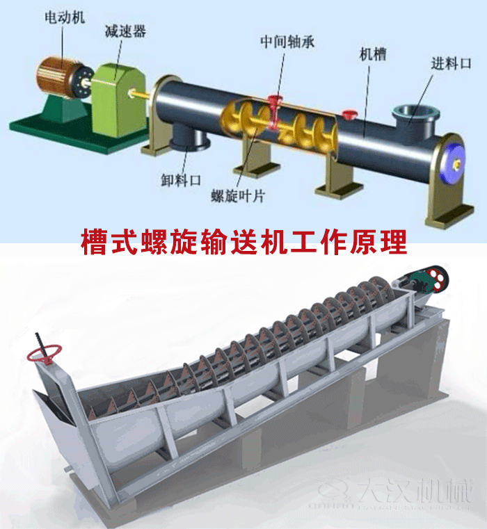 槽式螺旋輸送機是利用旋轉的螺旋將被輸送的物料沿固定的機殼內推移而進行輸送工作,頭部及尾部軸承移至殼體外,槽式螺旋輸送機吊軸承采用滑動軸承,設有防塵密封裝置,槽式螺旋輸送機軸瓦一般采用粉末冶金, 輸送水泥采用毛氈軸瓦,吊軸和螺旋軸采用滑塊連接。