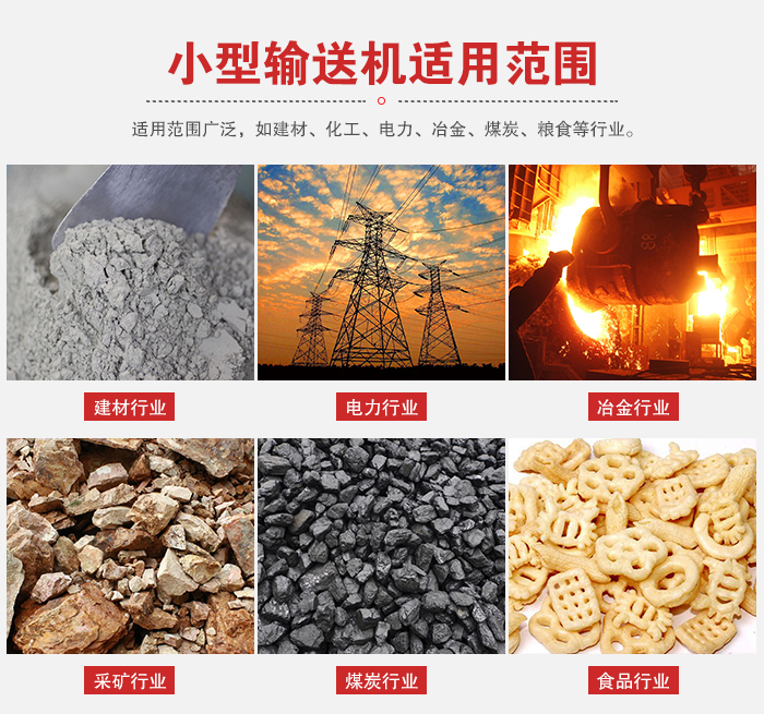 小型輸送機適用范圍廣泛,如建材、化工、電力、冶金、煤炭、糧食等行業,適用于水平或傾斜輸送粉狀、粒狀和小塊狀物料,如煤、灰、渣、水泥、糧食等。
